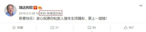 来自“微博国际版”的4条内容中,一条是Dalio在2019年春节给大家拜年: