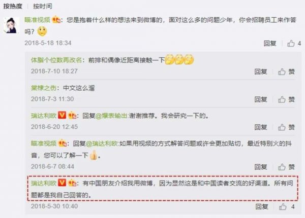 当然,也有用户质疑Dalio是抱着什么样的想法来微博,用户还询问“关于提问的互动是不是招聘员工来作答”。对此,Dalio给出了答复:“所有问题都是我自己回答的”。