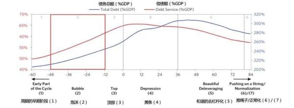 七个阶段:一个长期债务周期会经历七个阶段,即早期、泡沫期、顶部、萧条、去杠杆、“推绳子”、正常化。