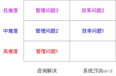 这三种方案,按照方法类型(咨询解决/系统解决)和方法难度(高难度/中难度/低难度)可以分为六个象限。比如,管理问题1的解决方案属于咨询解决和高难度方案,管理问题2的解决方案则属于咨询解决和中难度方案,效率问题1则属于系统解决和中难度方案。