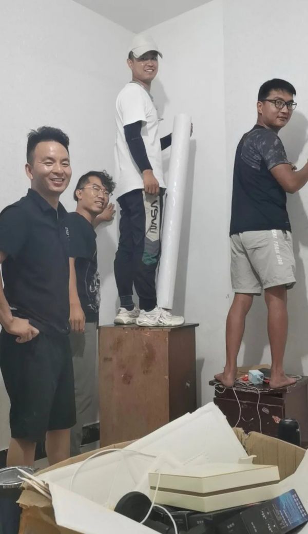 来哥(左二)和尚晓营(左一)在安排贴墙纸装修办公室