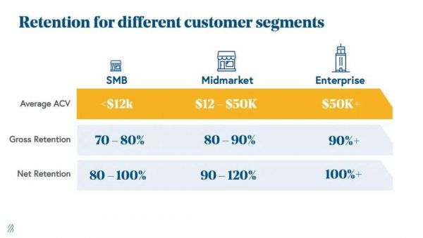 在考虑客户留存率时,我们还要考虑到有些SaaS公司的客户群体可能非常多元化,包含大量小客户,在这种情况下大量小客户的流失会让客户留存率失真,这时就可以将GRR作为补充,看到流失客户对于总MRR/ARR的贡献情况。这种方式可以帮助我们更好地分析公司的业务发展情况,以对公司未来的发展作出更为准确的判断。