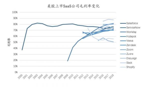 这一指标是软件行业的通用指标,但我们在探讨SaaS的时候往往会忽略它的重要性。毛利反映出的是收入质量以及产品的标准程度、客户黏性以及收入有效性等问题。SaaS企业的毛利率都有一个爬升过程,一方面是由于服务和订阅收入的占比发生变化,另一方面则是随着规模的扩张,规模效应逐渐显现,因此产品的毛利率会逐步增加。