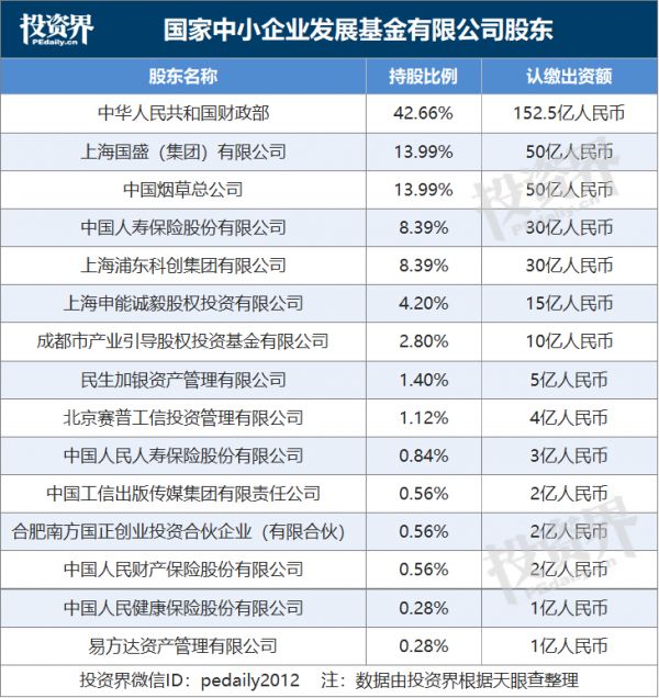 此外,多家险资进入,国家中小企业发展基金有限公司背后出现了中国人寿保险股份有限公司、中国人民人寿保险股份有限公司、中国人民财产保险股份有限公司、中国人民健康保险股份有限公司等保险行业巨头的身影。