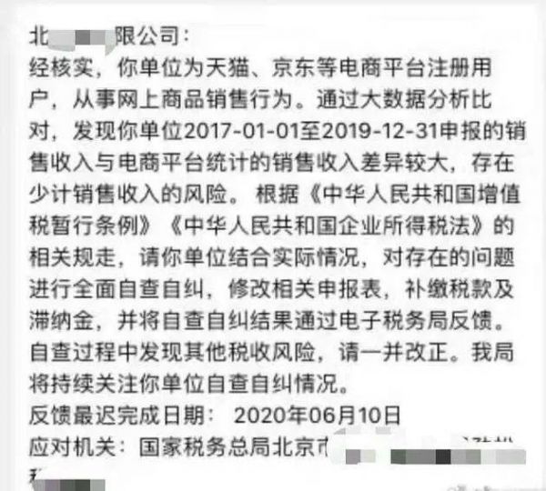 有公司收到通知称:“通过大数据分析比对,发现你单位2017-01-01至2019-12-31申报的销售收入与电商平台统计的销售收入差异较大,存在少计销售收入的风险,请自查自纠,补缴税款及滞纳金,”落款是北京朝阳区税务局。