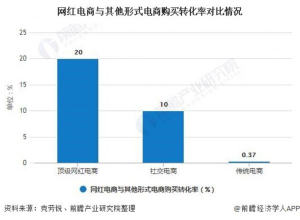 数据显示,顶级网红电商的购买转化率高达20%,而社交电商购买转化率最高仅为顶级网红电商的一半,传统电商购买转化率也仅为0.37%。