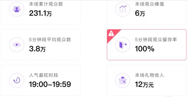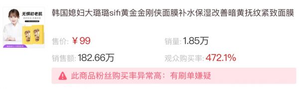 据小葫芦数据显示,某主播在一场直播中5分钟段观众留存率能达到100%,还有主播的商品观众购买率超高达到472.1%,远高于正常水平。