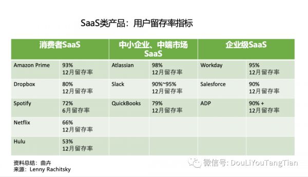 第一层是用户留存,只有终端用户持续使用,SaaS产品的价值才能被体现出来。下图总结了针对不同客户群体的三类SaaS产品的用户留存率。
