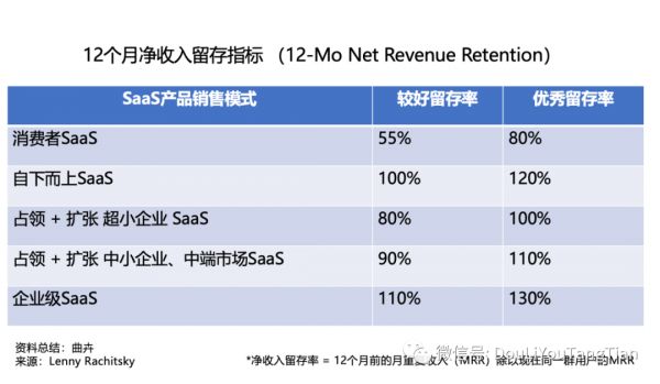 第二张图是主要针对面向B端的SaaS类产品的净收入留存率。这里的净收入留存率定义为12个月前的月重复收入(MRR)为分母,以现在同一群用户的MRR为分子的比例,注意这个数值可能大于100%,因为很多SaaS产品已有用户会有“扩张收入”,比如订阅计划升级,购买更多席位等。