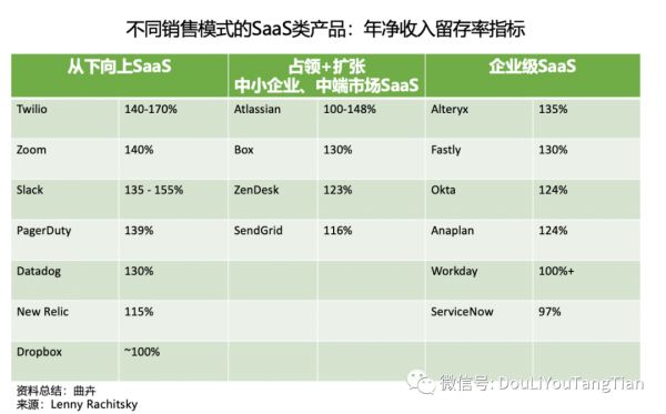 而占领+扩张模式(land + expand)的特点,同样也是初始合约较小,而销售推动后续购买较多,因此优秀的企业能做到净收入留存率大于100%。但是如果你针对的是超小型企业,由于你的客户破产的概率很高,因此拉低了净收入留存率。