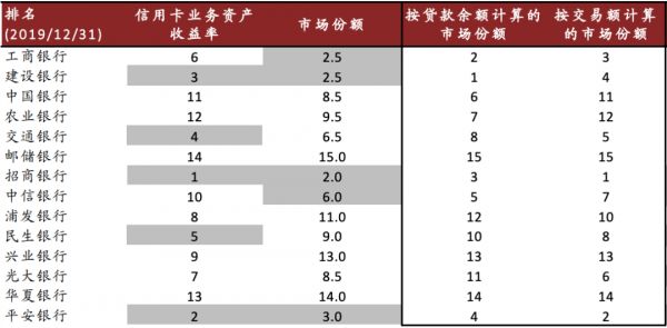 先来看信用卡业务资产收益率与市场份额:其中,“信用卡业务资产收益率为“信用卡收入/授信额度”,反映了银行获取目标客户和深度经营客户的能力;市场份额用交易额和贷款余额而非发卡量衡量。”