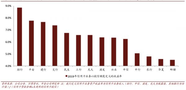 从信用卡业务资产收益率来看,招行、平安、建行、交行、民生银行,在全国性银行中排前五。具体的资产收益率数据还可以看下图(计算包括使用和未使用授信额度在内的信用卡业务资产收益率):