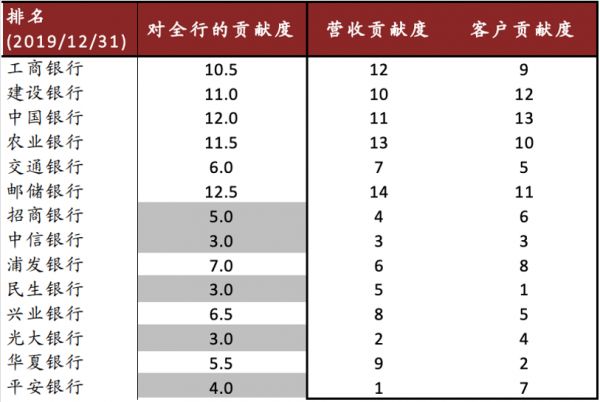 再来看信用卡对银行贡献度,中金公司主要统计了营收贡献和客户贡献两个维度。