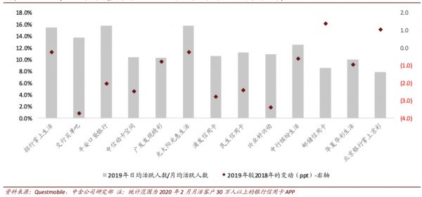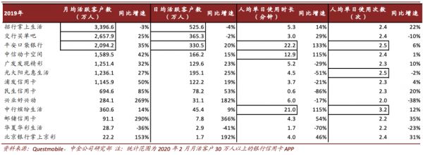 在年报中,大部分银行并未公布自己的信用卡客户月活数据,中金公司根据第三方机构Questmobile,统计了2020年2月月活客户30万人以上的银行信用卡APP。