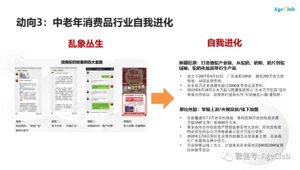 中老年消费品行业的第三个动向是,行业自身在快速的自我进化,从以往乱象丛生逐步向阳广华、正规化、产业链延伸的道路迈进。