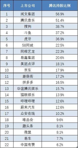 燃财经统计了在港股和美股上市的互联网公司,以上22家公司,都接受了腾讯的投资。从持股比例来看,腾讯最高占到56.87%(阅文集团),最低的也要高于6个点(有赞)。