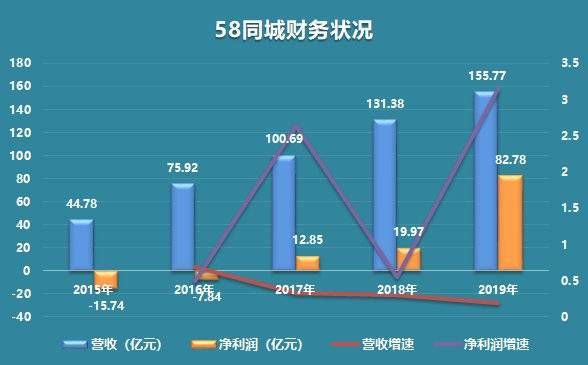 翻看58同城近年来的业绩,营收上,58同城最近5年来一直在增长,但公司的营收增速自2016年以来一直在下滑;净利润方面,58同城在2015年和2016年亏损,2017年扭亏为盈。值得注意的是,公司在2018年净利润增速大幅度下滑之后,2019年有了314%的增速,净利润达到82.78亿元。