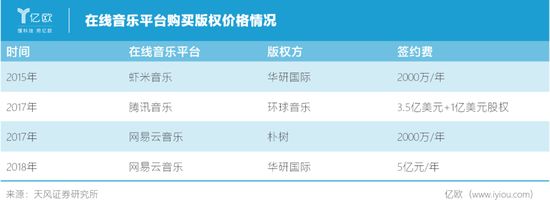 以华研国际版权为例。华研国际曲库数量约2000万首,拥有艺人包括SHE、飞儿乐队、林宥嘉等。2015年虾米音乐以2000万的价格获得华研国际三年独家代理权,但2018年合约到期后,网易云为了取得该公司版权,将价抬升至5亿元并最终拿下。