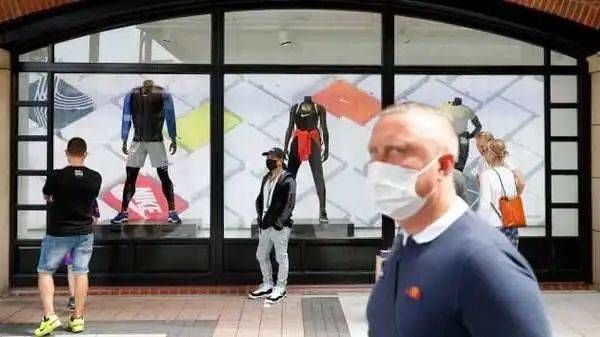 ▲6月16日,英格兰朴茨茅斯一家购物中心新开业的耐克门店,购物者正在排队进店。