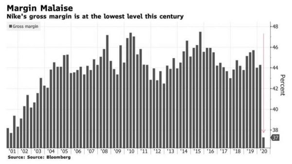 ▲耐克录得本世纪最低的毛利率。