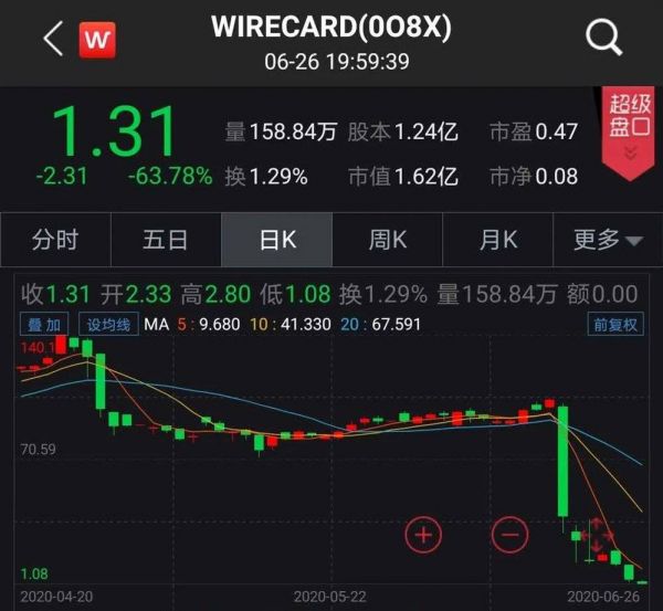 受破产消息影响,截止发稿前,Wirecard股价已跌至1.31欧元,其市值也仅剩1.62亿欧元,在短短十天内便蒸发了近127亿欧元。