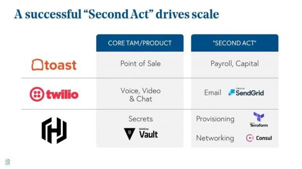 “Second Act”可以理解为在主产品外开辟的第二条产品线,通常来说,新产品线的开设主要为了提高SaaS公司可触达的市场规模,销售给已有客户和新客户。大部分SaaS公司在发展到一定阶段后都会开始扩张自己的产品线,我们熟知的Workday(人力资源+财税)、ServiceNow(ITSM+ITOM+……),从美国的经验来看,这是SaaS公司发展的必然道路。