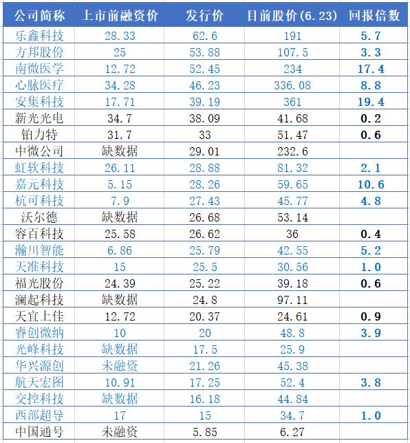 以7月22日挂牌上市的首批25家公司为例,投中网梳理发现,剔除缺上市前估值数据的7家公司之后,其余的18家公司全部为上市前的投资方带去了正回报。回报倍数最高的是安集科技,回报倍数高达19.4倍。