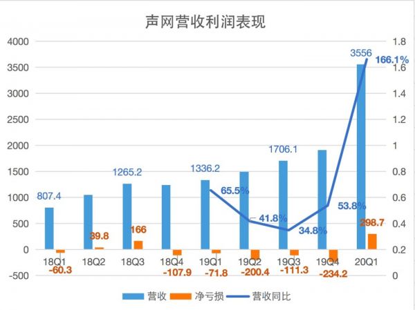 2020年第一季度主要受疫情影响,实时通讯需求全网暴增,声网营收涨至3556万美元,同比去年增长166%,已经达到去年全年一半的收入水平,净利润则再次扭亏为盈为278.7万美元。