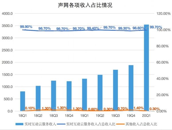 从业务营收来看,声网Agora的收入几乎全部来自于云服务。2018年、2019年实时互动云服务收入占比总收入分别为98.95%和99.22%,2020年第一季度这一占比更是提高到99.68%。