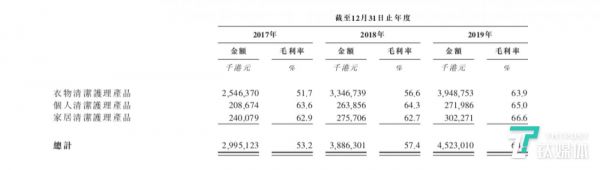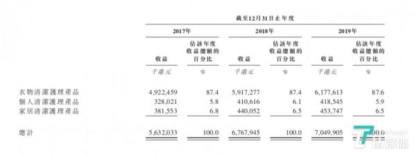 2019年,公司衣物清洁护理产品营收占比87.6%,录得61.78亿的营收。