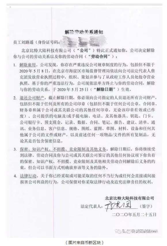 5月25日,詹克团以北京比特大陆法定代表人的身份签发了对刘路遥的"解除劳动关系通知"。