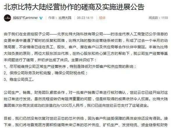 同样在6月23日,吴忌寒控制下的微信公众号“蚂蚁矿机ANTMINER”发布了关于北京比特大陆经营协作的磋商及实施进展公告,表示本着为比特大陆负责的原则,两位大股东派出代表,在热心股东和热心第三方的帮助下,就公司生产经营等基本问题进行了磋商,并初步达成了共识。主要共识包括:第一,尽可能维持公司正常生产经营秩序,特别是降低对外部客户和供应商的影响;第二,保持公司账务及时和完整,确保公司财税合规;第三,稳定公司员工。