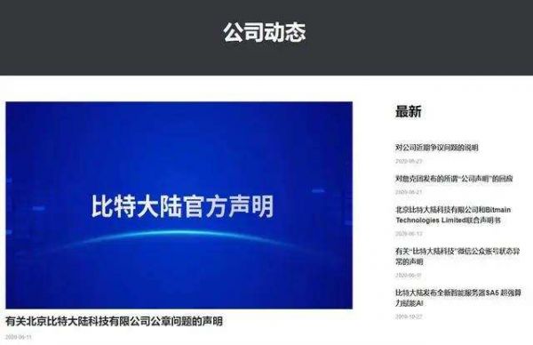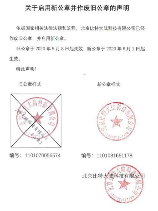 一天之后,比特大陆官网发布声明称,北京比特大陆和香港比特大陆发现微信公众号"比特大陆科技"于2020年6月10日登陆状态异常,并宣布当日发布的信息内容虚假,不代表北京比特大陆真实意志。目前唯一合法有效的公章是编号为1101070056574的公章。