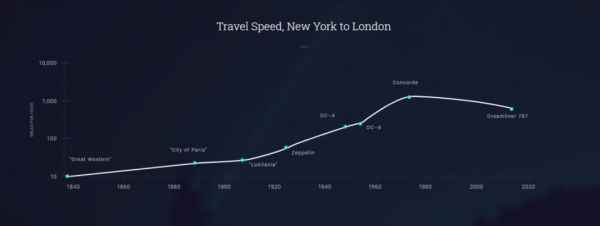然而,在过去的30年,我们再也没有在交通领域看到革命性的进步。举个例子,自从工业革命以来,我们第一次发现,横穿大西洋的旅行时间居然变长了。