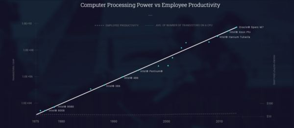 但是,正如使用过彭博(金融行业)和 Lexis(法律行业)数据库的任何人所能证明的那样,我们收集的数据量显然超过了我们轻松运用它的能力。一种看待这种情况的方法是将计算能力的提高(通过芯片上晶体管的密度来衡量)与生产力的变化进行比较。