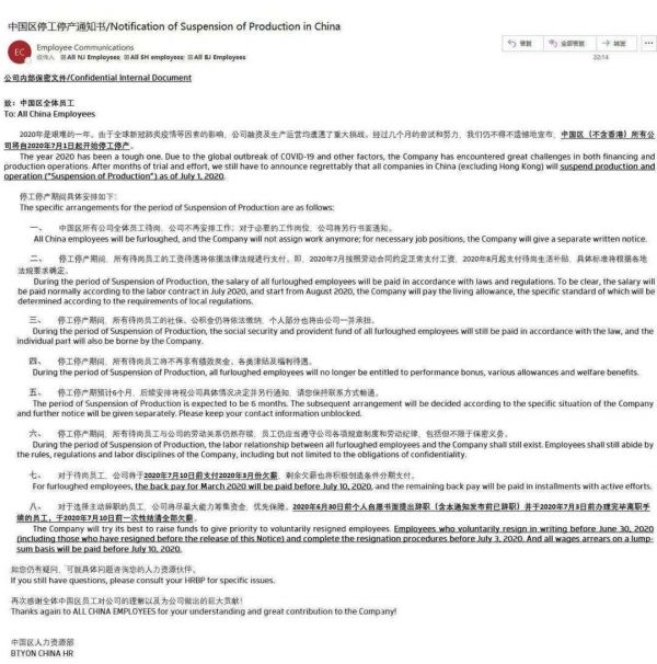 6 月 30 日,据未来汽车日报报道,拜腾汽车 CEO 戴雷在前一晚组织召开了中国区全体员工电话沟通会,宣布自 7 月 1 日起暂停公司在中国内地的业务运营。在停工停产期间,大部分中国区员工将待岗,仅有小部分员工留岗值守,维持公司最基本的职能运转。