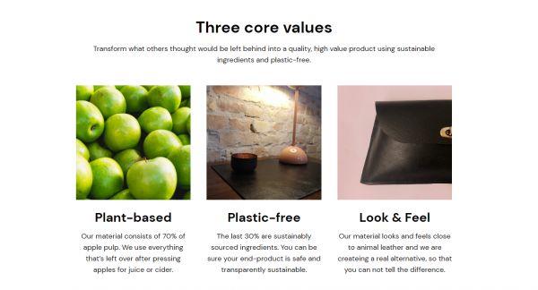 Beyond Leather Materials 是B2B供应商,研发以水果为基础的皮革替代品,提供给时尚行业的制造公司。其中水果来源于果汁和苹果酒生产过程中的副产品,制造出来的皮件不会腐坏、招虫,也相当美观时尚。另外,Beyond Leather Materials 的产品是完全可生物降解的,比动物皮革更具可持续性,也可以降低对环境的污染。