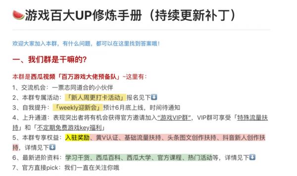 除了高价签约头部游戏创作者外,西瓜视频对中腰部游戏创作者也给予了政策支扶持。根据《西瓜游戏百大UP修炼手册》显示,新人游戏创作者只要登记自己的西瓜和B站账号,就能获得价值500元的入驻奖励。