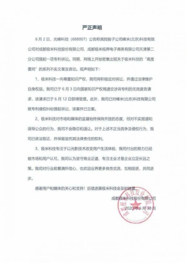 6月30日,极米在其官方微博发布声明,重要传递了2个增量信息:一是已对光峰科技进行专利反诉,二是对媒体的不实报道已依法取证并保留追究法律责任的权利。