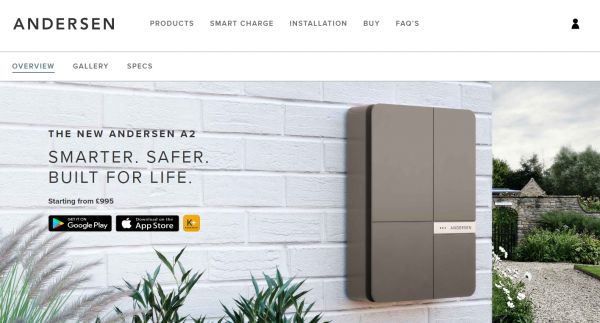 Andersen EV 曾推出充电点 A2 ,在 A1 的基础上升级为三相充电桩(Three-Phase charger),输出功率达22千瓦,是 A1 输出功率的三倍,充满80%的电只需要30分钟。A2 充电点还能连接太阳能电池板和电源墙,能够将太阳能储存在电源墙中为电动汽车充电。