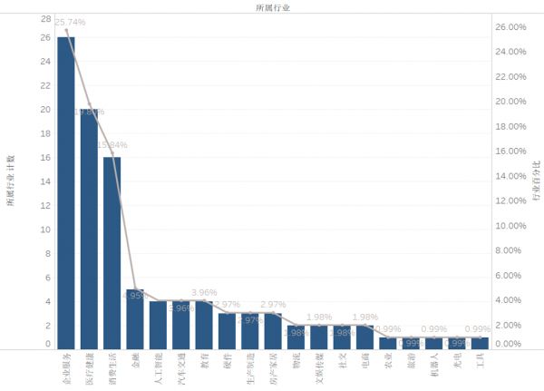 在赛道分布看,本周Top 3热门融资赛道分别为:企业服务(26笔,占比25.74%)、医疗健康(20笔,占比19.80%)、消费生活(16笔,占比15.84%)。与上周相比,这周热门赛道的投资数量大多数翻倍增长,文娱赛道则从上周的 8 笔滑落至仅有 2 笔融资。