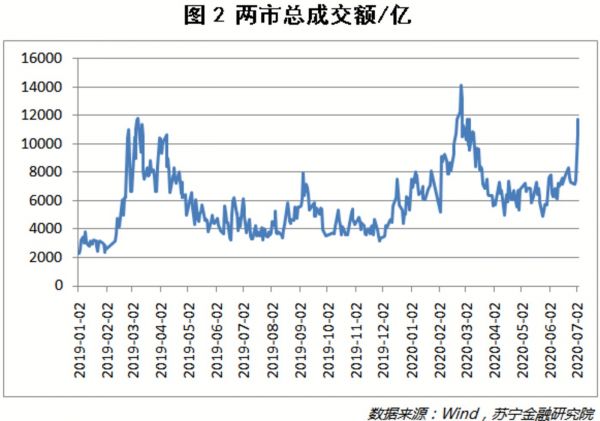 上周,两市总成交额迅速放大(见图2),再次突破1万亿大关,7月3日更是达到1.17万亿,为近4个月来新高。从技术层面来说,价格的向上突破若没有成交量的配合,极有可能是假突破;而从历次牛市来看,每次牛市启动均伴随着成交量的快速放大,因此可以说成交量放大是牛市的必要前提条件,但并不是充分条件。