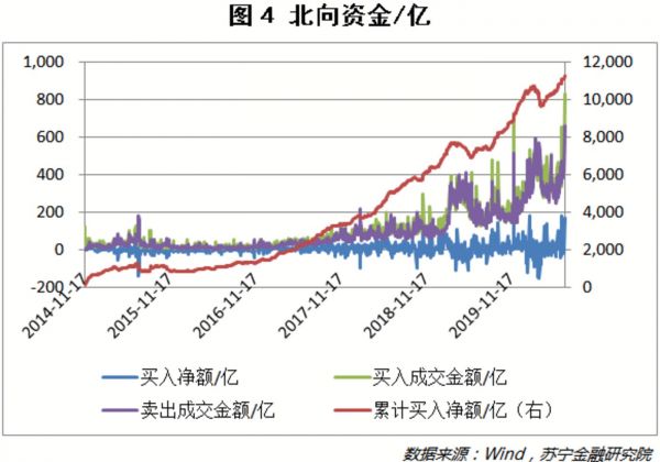 在国内资金快速聚集之际,北向资金也不甘示弱(见图4),连续两日净买入超过100亿;当前累计净买入额已超1.14万亿,创历史新高;7月2日当天,北向资金全天合计成交金额为1491.7亿元,占比超过A股总成交额的10%,创历史新高。何况北向资金作为外资配置A股力度和情绪的指标,对于A股市场具有显著的指导意义。