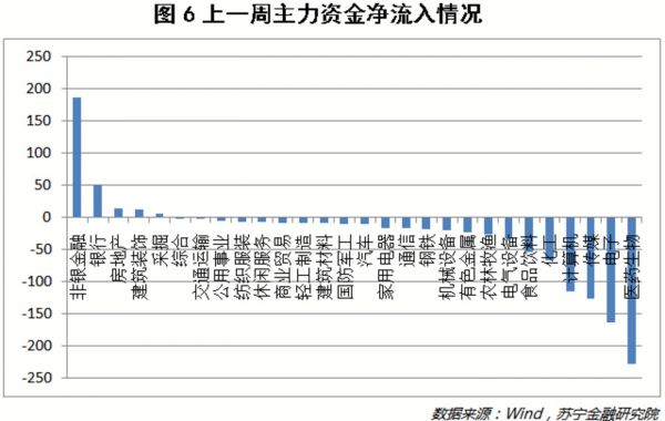 从资金面看(见图6),上半年受市场资金冷落的金融、地产在上周明显受到资金青睐,而医药、电子和计算机的主力资金则大规模流出。从风格来看,市场关注的焦点从上半年独领风骚的科技成长行业转向低估值的大盘权重。