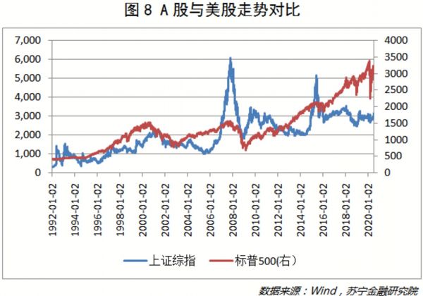 反观美股市场(见图8),虽然也经历了大萧条、互联网泡沫、次贷危机时刻的泡沫破裂,但长期来看,整体的牛市结构并未改变。2000年以来,标普500历史波动率平均值为17.6%,而同期上证综指的波动率为23.5%,A股市场的波动程度远大于美股。