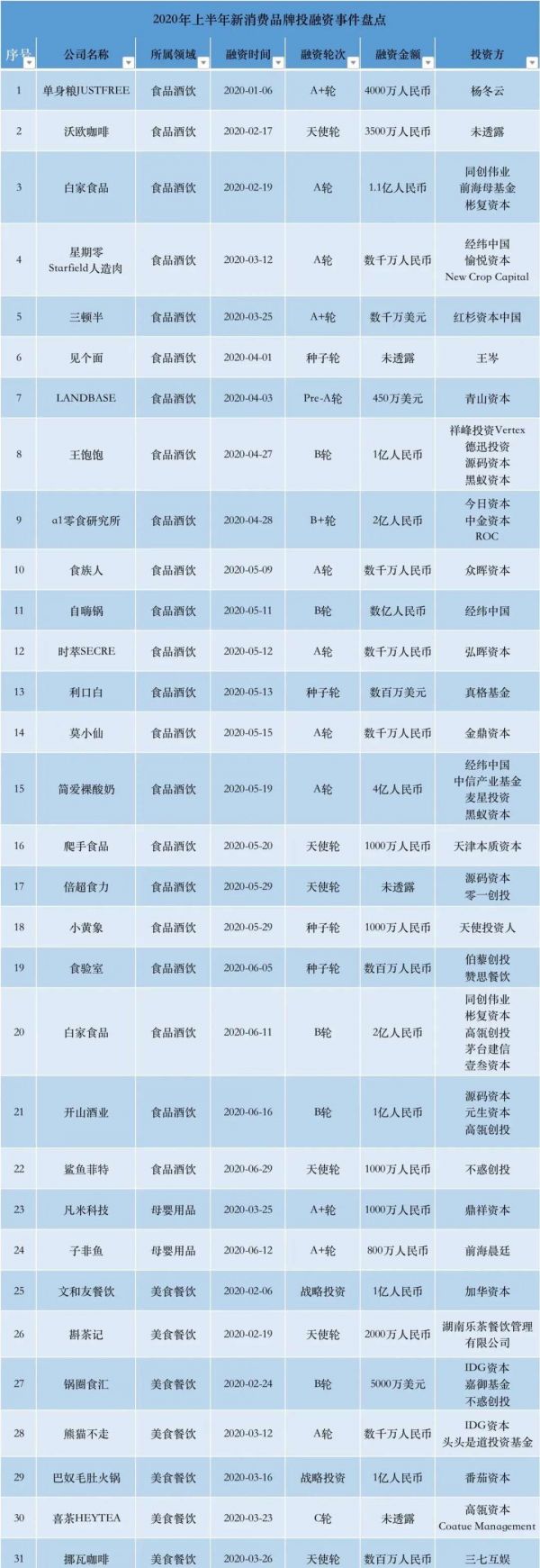 此外,2020上半年,新消费赛道共发生亿元人民币以上融资事件共18起,千万人民币以上融资事件30起;而在2019年上半年,新消费品牌融资事件亿元人民币以上融资事件仅10起,千万人民币以上融资事件为30起。