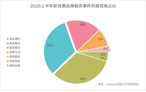 2020上半年新消费赛道,食品酒饮项目获得融资最多,共计22起,占总融资事件的33%;其次是美食餐饮共计21起,占比为32%。
