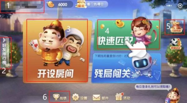 1.个人信息;2.好友排行榜;3.开设房间(主要用于邀请微信内好友);4.快速匹配(主要用于快速组局一场游戏);5.分享有奖(通过分享到好友或微信群换取游戏豆);6.战绩(类似于好友排行版)。