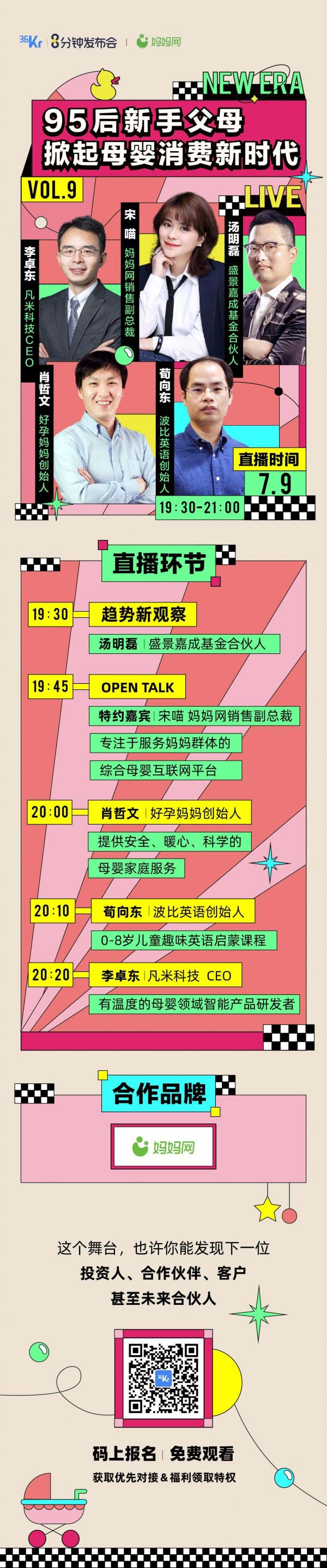 在本次8分钟发布会的现场,我们请到盛景嘉成基金合伙人汤明磊,垂直母婴媒体平台妈妈网,以及3位母婴行业的创业者,与我们一起聊聊“年轻家长们的母婴市场“。