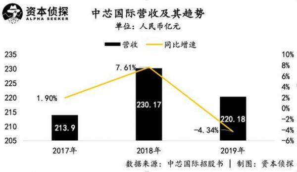 中芯国际招股书显示,2017到2019年,中芯国际的营业收入分别为213.9亿元、230.17亿元、220.18亿元,2017、2018两年同比实现1.9%、7.61%的增长,而2019年,中芯国际的陷入负增长,营收同比下降4.34%。